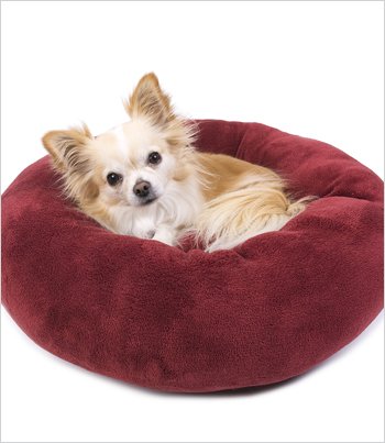 Finally, a donut that won't add inches to your dog's waistline! Plush, filling encased in soft, terry fabric will entice your small dog to curl up and take a snooze. Dark Rust color with a diameter of 20", the Snoozzy Donut Bed is 100% machine washable. Machine wash cold, gentle cycle and dry flat.